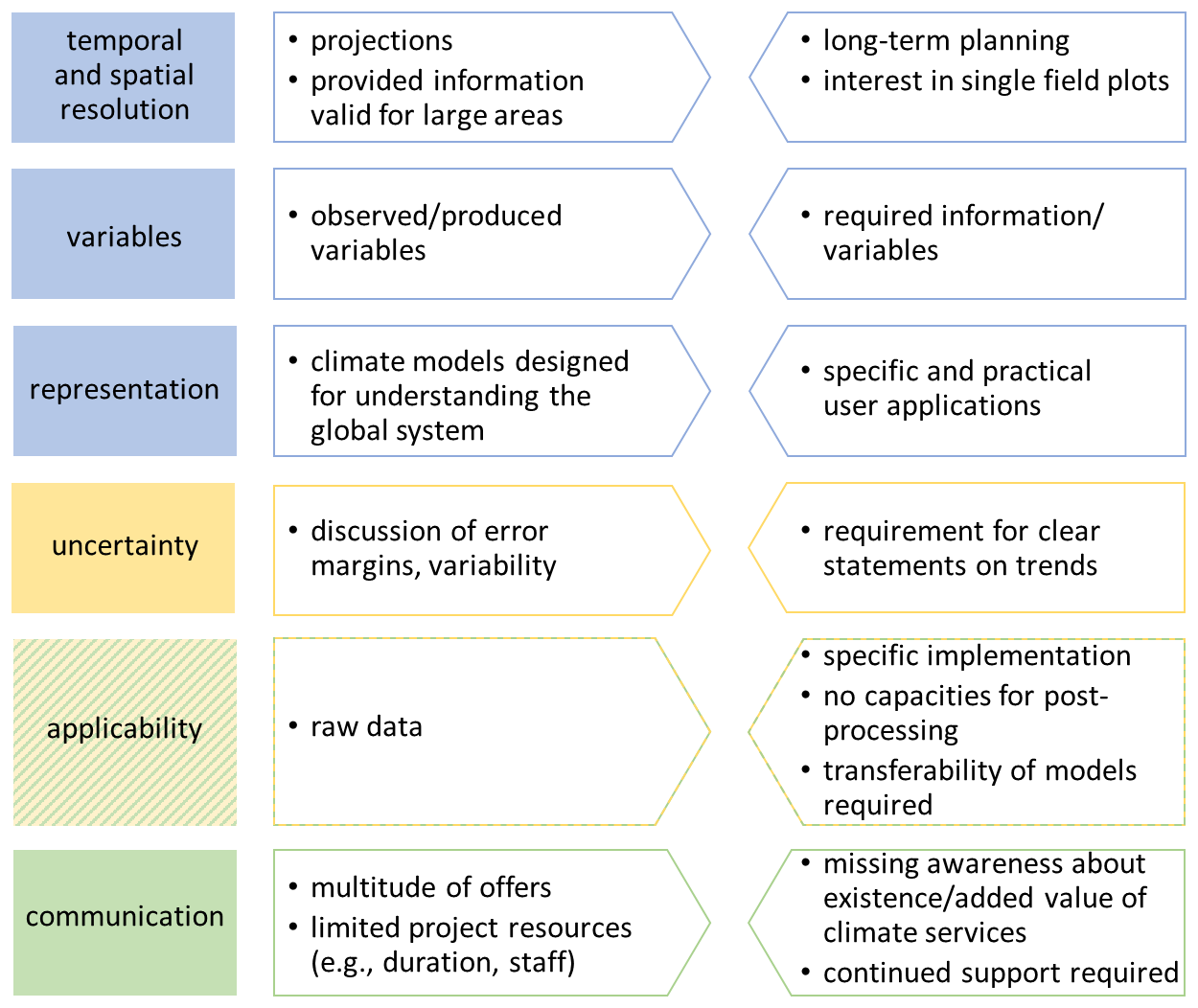 Figure 2Dimensions of the gap between requests of potential climate service users (right) and providers (left) corresponding to different categories: technical/data-related (blue), application (yellow), exchange (green).