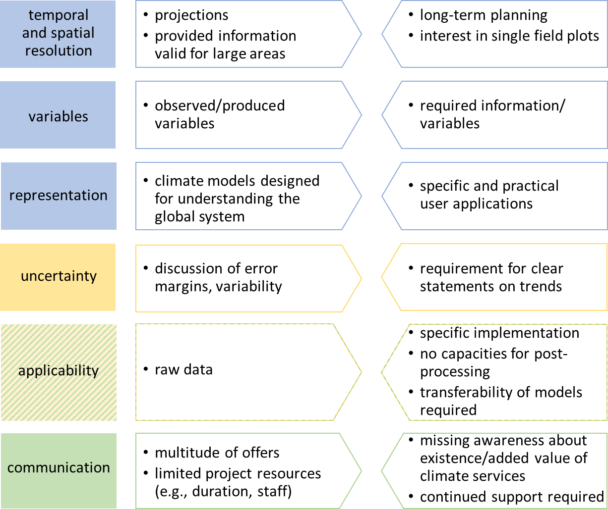 Climate services are increasingly required to go beyond purely user-tailored data bases for adaptation management, by acknowledging their design process, i.e., the trans-disciplinary knowledge exchange between science and users (e.g., Jacobs and Street, 2020; Findlater et al., 2021). Reconciling offered services and requested information and creating meaningful use thereof though remains challenging. While climate scientists tend to overestimate the usability of their data in real world problems, potential users often lack training in climate science, thus failing to see chances and limitations of the data (Jacobs and Street, 2020). This is reflected in two different paradigms and thence a mismatch in climate service creation: supply-driven, i.e., based on improvement of available data, and demand-driven, i.e., based on improvement of decision-making (Findlater et al., 2021; Raaphorst et al., 2020). Our contribution states and describes a multi-dimensional gap between information required by users and data produced by scientists which can result in delayed or inhibited decision-making and subsequent implementation of possible solutions (Weaver at al., 2013).