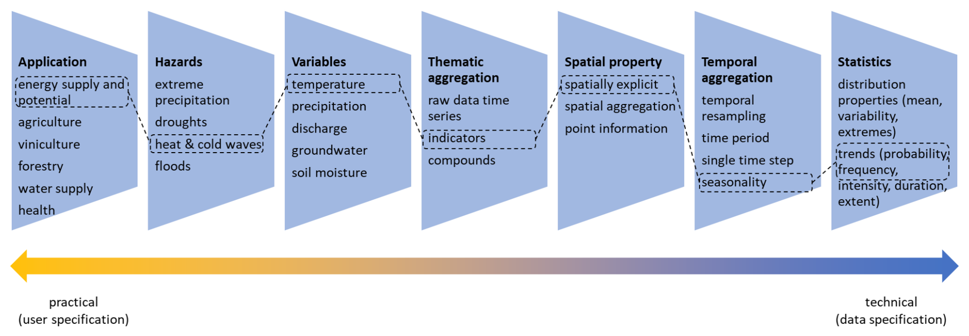 A climate service like cooling/heating degree days for energy suppliers may thus be described in terms of the topic (energy supply and potential), the hazards to be considered (heat and cold periods), the variables to describe the hazard (temperature), the decision for defining an indicator as opposed to compound events or using raw time series, the spatial and temporal aggregation (seasonal maps) and the statistics of interest (frequency trends). Temporal and spatial properties refer to the selection of single time steps and periods (e.g., historic, present, future, counterfactual), locations and areas, and the resampling to requested time steps (e.g., hours, days, years) or spatial resolutions. Last, choices on the statistical processing allow to tailor data further towards specific use cases (e.g., trends of extreme events, inter-annual variability). Besides the categories described in Fig. 3, more technical issues, such as the data source (e.g., observations, model projections), data format or the way of conveying and providing climate services, have to be agreed upon. The framework structure, the categories and the elements from which to choose can be adjusted to the context it is used in.